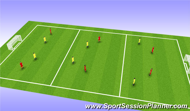 6v6. Field set out in thirds. Players can roam throughout all of the thirds.