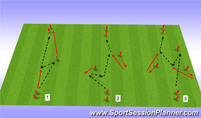 2) Both central players make a movement to receive a pass. The player receiving must pass back to the original passer who now plays a pass into space for the non receiving player to dribble out