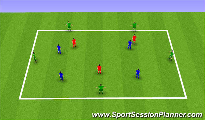 Description: The 3 players in red simulate a midfield 3 and will play with green to keep possession of the ball. Blue will attempt to win the ball and find coach