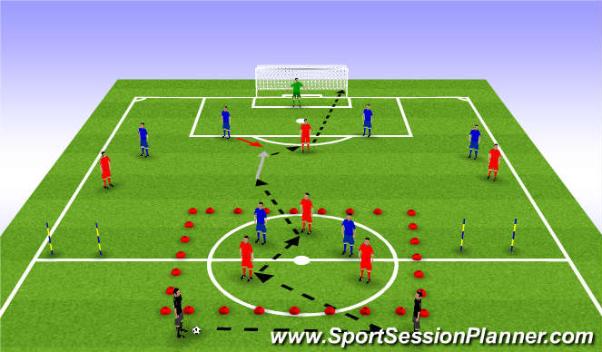 Set Up: Game on half a field. Reds in a 3-3-1 w/ triangle midfield. Blues in 2-4-1 flat midfield