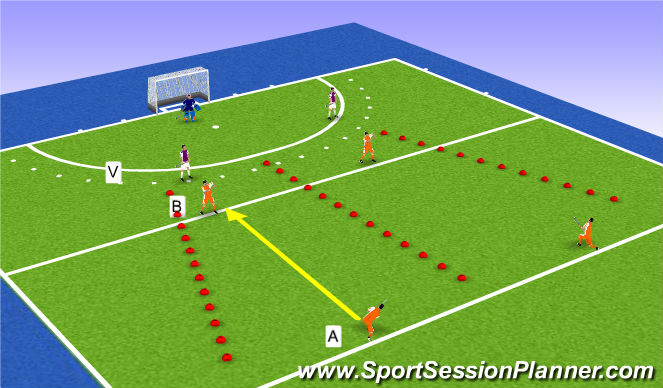 Aan twee kanten vak maken en oefening kan grotendeels parallel verlopen. A speelt scoop op B. Zodra B de bal onder controle heeft mag V druk geven. A en B spelen tegen V en de keeper een 2-vs-1.