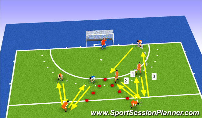 aanvaller 1 is weggelopen richting de achterlijn, krijgt de bal aangespeeld