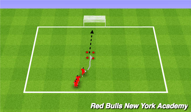 Players are to run with the ball and finish when inside the box. After they've shot, they become the goalie. The goalie chases the the ball that was just shot and goes back in the line.
