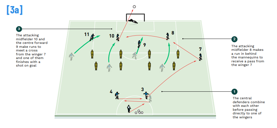 Mid players passing the ball, pass it wide to 7, wide mid passes the ball to inside the box to 8, and 8 crosses to 10, coming from behind