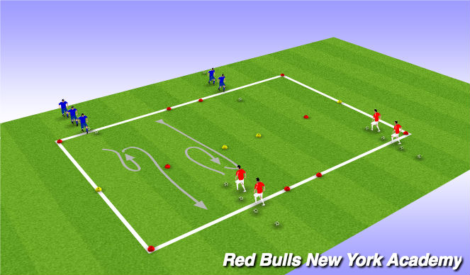 2. Once Red player arrives at cone, Blue player atempts to win the ball
