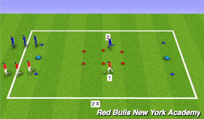 1 must dribble next to the blue cones where 2 must shadow the ball.