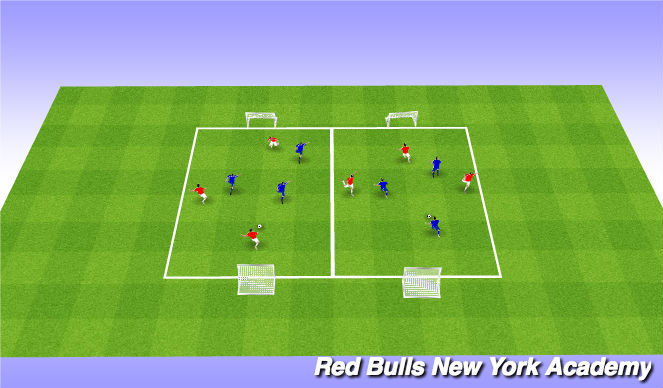 1 field, 2 teams, two goals facing outside of the field in the middle. 1 team starts with all the balls