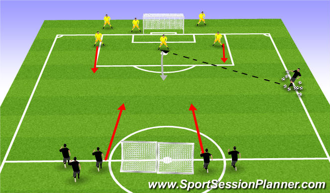 -if attacking team scores or ball goes out of bounds, or goalie makes a save, the person who shot the ball or lost control of the ball becomes the defender for a 2vs1 going the other way, the other 2 players get quickly get back to their line. The coach will quickly play a pass into the black team for a 2vs1 attack going the other way. After a goal, or ball out of bounds play is restarted again after the 2vs1 attack.