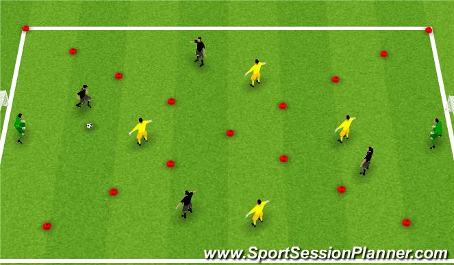 -4v4/5v5 small-sided game with field divideed into 4 areads with diagonal lines. Aim is for players to stay within their zones and move the ball into their team mates in other areas (lots of 1v1 duels).