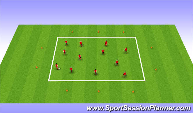 Cones placed outside the square. On coaches command, players will run (skip, shuffle) around cones and get back to their ball to continue technical exercises.