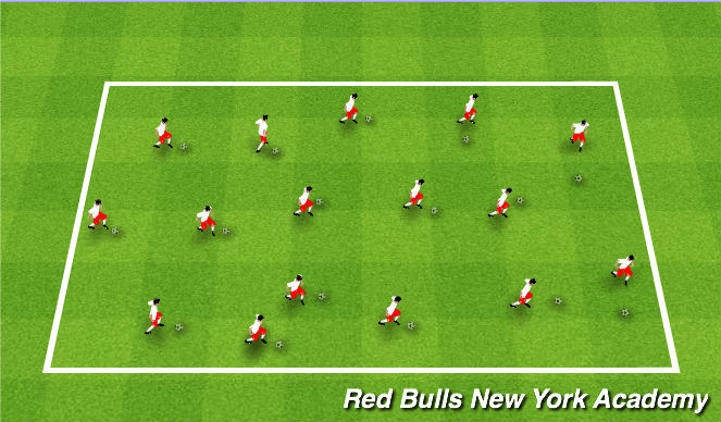 Instructions: Following ball mastery and juggling, players dribble their ball in area. Perform various actions on coach's command (e.g. roll, inside of foot, outside of foot, and so on).