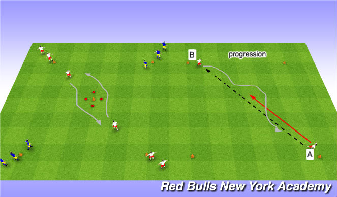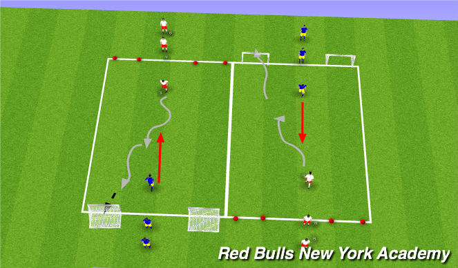 2. Red players must dribble towards defender and attempt to beat them with the dribble
