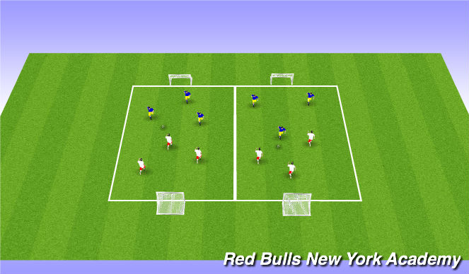4. If blue player wins the ball roles are switched instantly and Blue team will attempt to score on the red teams gates (dribble through under control.