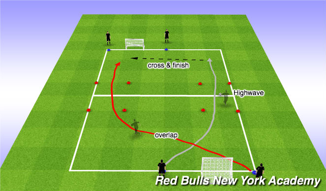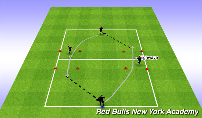 2. Ball starts with middle player who dribble though the box and performs the high wave, takes the ball down the line and gets the cross in.