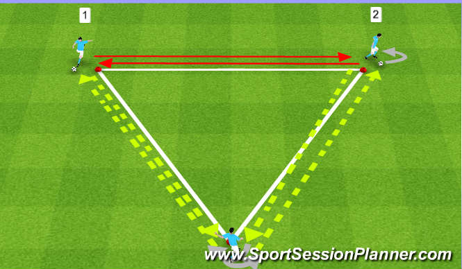 Set Up: Triangle of equal sides of 8-10 yards and two players with a ball.