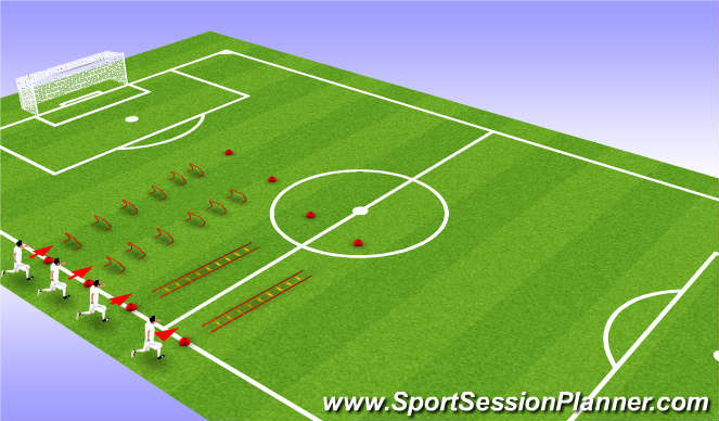 Hurdles: Dead leg right; dead leg left; one foot in each; two feet in each; two feet sideways; two feet sideways other direction; two feet with switch in middle; Icky shuffle forward; Icky shuffle backward; two-footed hops