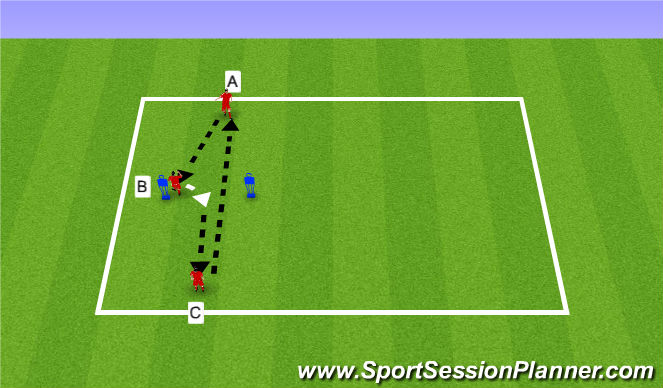 Player A starts with the ball and passes to player B. Player B's first touch should be to turn the defender while using their arm to keep their defender on the opposite side. Make sure the first touch takes it wide enough to not allow the defender to reach, then pass to player C. Player C returns the ball to player A who passes back to player B.