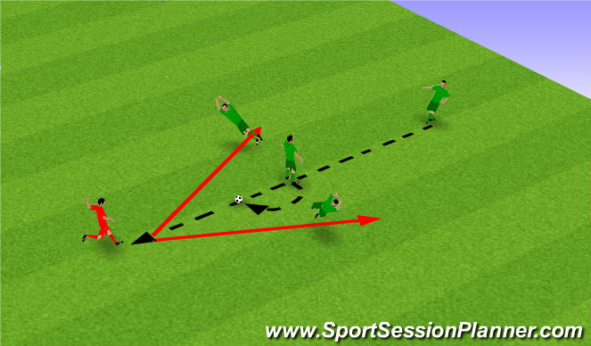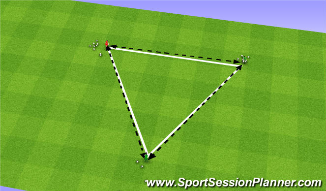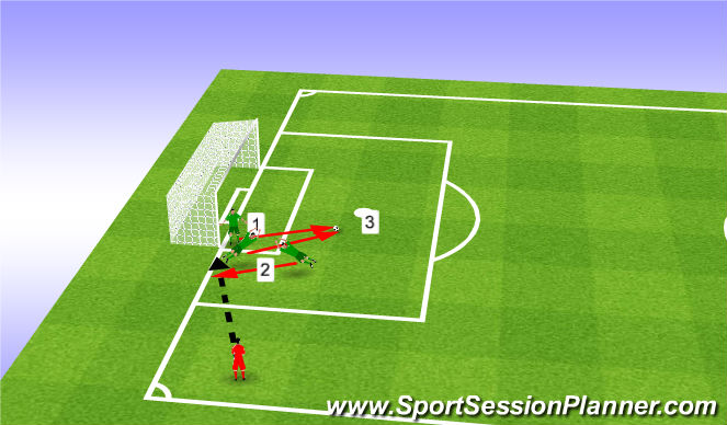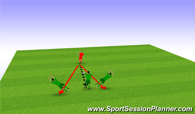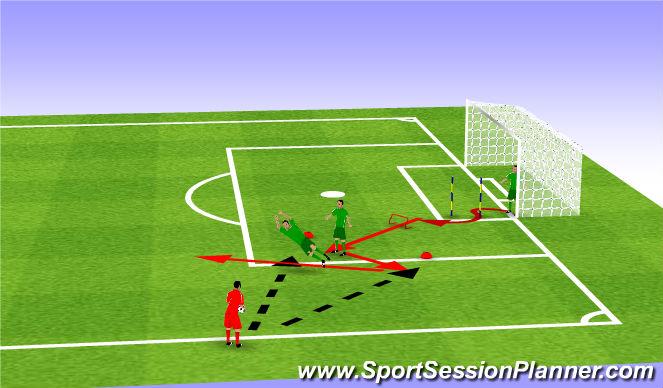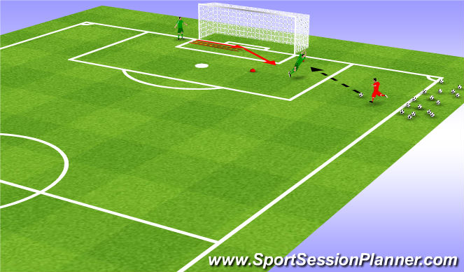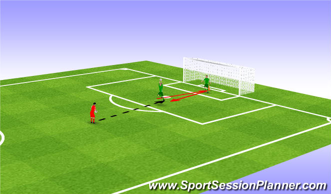 Keeper (green) and feeder (red) pass ball between each other. Feeder decides a suitable point to play the pass wide for the keeper to react on by diving and saving.