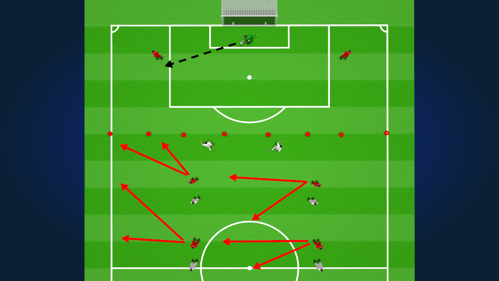 Coaches, this is an idea of what we need to work on during the Goal Kick. When the goalkeeper passes the ball, the attackers cannot press and go beyound the area surrounded by cones, but as soon as the defender touches the ball, the opposing team can press. Pressure does not need to be done with just 1 player, The illustration is just to give you an idea e visulaize how we can play, as this will depen on the type of game you have ahead and then some suggestions on where your players can move to receive the ball, pull the marker so that other players have more options to receive and/or pass, combine plays, etc.