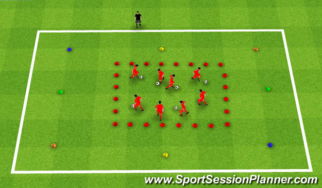 To begin the exersize have your players dribble in the inner box. The coach can introduce soccer related activities for the players to do while dribbline (toe taps, foundation, different turns)