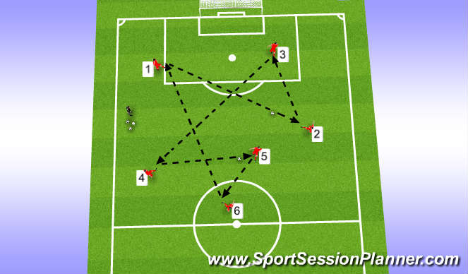 Number passing activity. Groups of 4 to 6 players, two balls per group, and players count-off numerically. Player's 1 and 4 begin with a ball as shown.