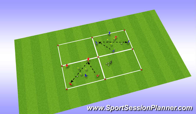 The 4 players in possession look to score with a penetrating pass through the triangle to a teammate. The defender tries to cut-off the pass, but is [not] allowed to defend inside the triangle. Progress by limiting the number of touches in possession. Note: if the defender wins the ball, they score by dribbling outside of the area. Rotate the defender after a period of time.