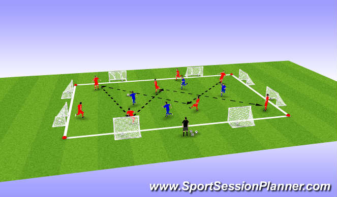 8 v 4 possession activity in the middle. The 8 players in possession are awarded a point for maintaining possession for 8 consecutive passes. The 4 defending players attempt to win the ball and quickly pass through any of the 8 small goals along the perimeter. Play for points or time, rotate players accordingly.