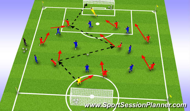 Team shape and balance. Change of rhythm in possession (short, short, long). Be patient, don't panic. Verbal and non-verbal communiation. Defenders - when you win the ball, look for opportunities to penetrate immediately.
