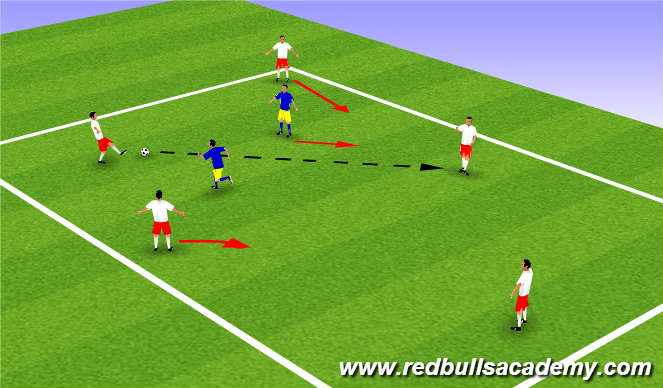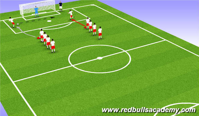 Winger should dribble towards the line forcing goalkeeper to commit to him/her before he/she makes pass