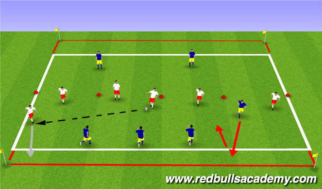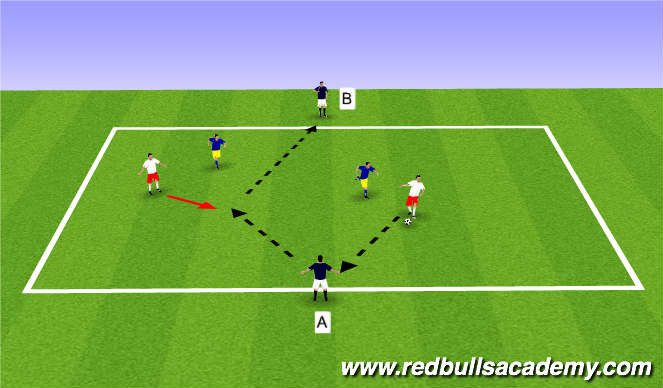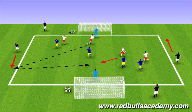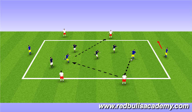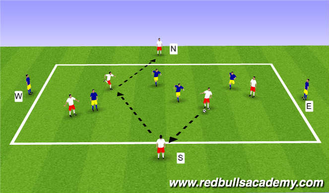1. Objective is to play forward so encourage target players to pass through when defenders are split