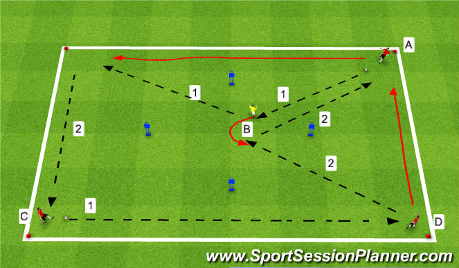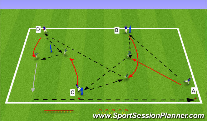 Il est important de respecter le rôle du joueur B qui anime le circuit de passe; les joueurs autours se mettent dans le tempo et le rythme de B