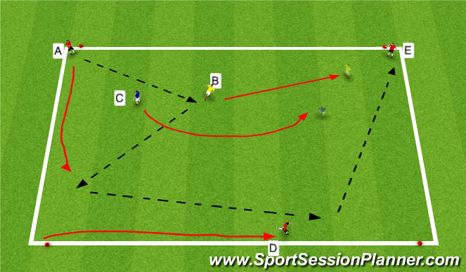 D donne à E et la séquence repart avec E qui recherche le une deux avec C qui se démarque dans le dos de B; C redonne à E qui joue sur A en profondeur; A redonne à D et une 3 ème séquence repart avec D et B...