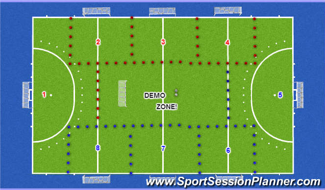 Two groups are seated in the two coloured areas. It is time-efficient to place alle the groups of one pitch in one area for a speedy send-away (for example groups 1-9). You need at least four demo-players for the entire demo, of which all are able to slide (!)