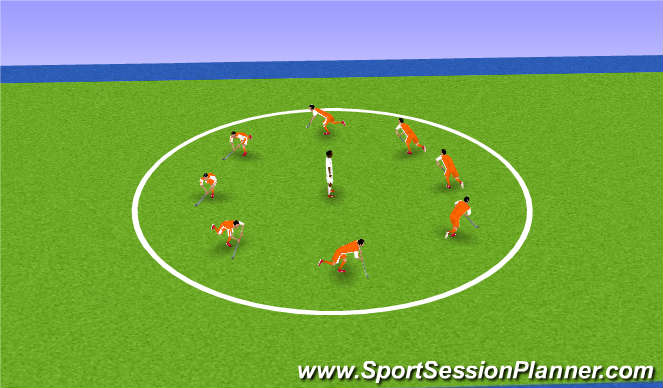 The leader of the warming-up stands at the center of the pitch while everyone else (staff included!) runs around him in one circle. For younger groups (<14) without ball. For older groups (>14) with ball. The trainers shouts orders from time to time, which the Kids (and staff!) have to execute. Obviously, these orders are also aimed at making them wet, to overcome the fear of sliding and rolling.