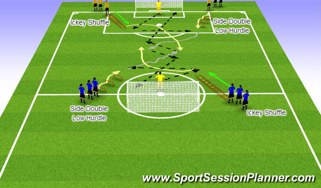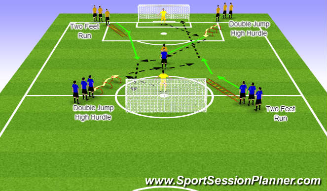 Same as above. Must be done at game speed after the physical activity. Good communication and nicely weighted balls on the overlap for one touch finishes.