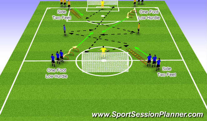 Divide two groups. One going to one goal, the other team attack the other goal. One team at a time. Players start physical activity at same time and then complete the movement. Remind players to: