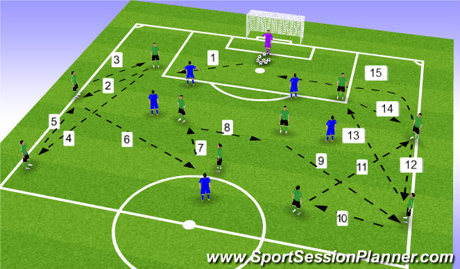 - Players will make their own passing pattern in the midfield three but it has to touch every player before being passed out - Players move in logical order