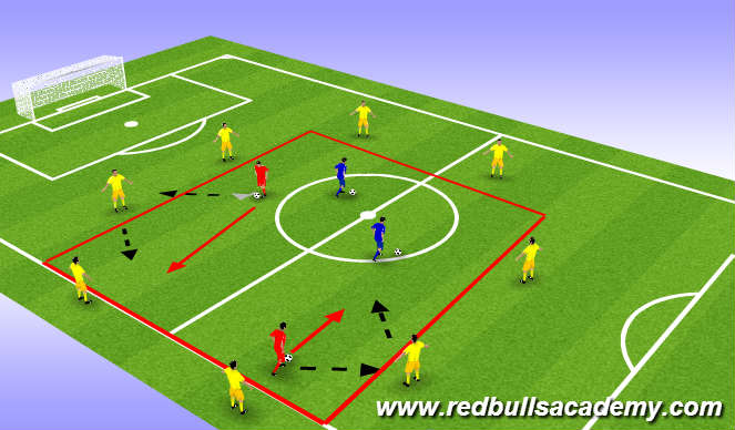 -Fun Warm- Up game - 2 red player and 2 Blue player- all four players with a ball The 8 remaining players will be outside around the Grid as Servers - The objective how many wall-pass can we connect in 1 min- before making the pass add footskills into it