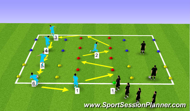 1, Start at Green cones 2, diagonal runs around red cones. 3, Enter the blue square where a player will be waiting with a ball in their hands. Perform with the player, Throw head head catch and 4, replace the player holding the ball in your hands and wait for the next player to enter the box and repeat. Once complete, move on to the next box 5, marked in yellow perform five passes with the player waiting and 6, replace player and wait for the next player. Once complete begin at position1, and repeat whole circuit as many times as you can in ten minutes.