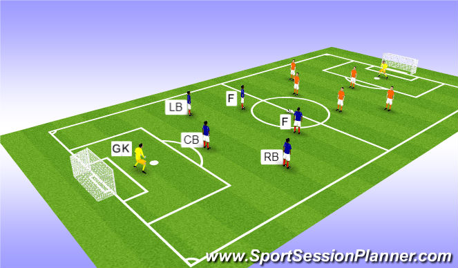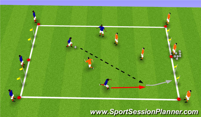 Use a 30x25 grid and put gates at each end. Split the kids into two teams and have each team on opposite ends of the field. The game is initiated by one team passing the ball into the second team. The team receiving the ball will send two players and the defending team will only send one player. At this point the three kids on the field will play 2v1. They can pass or dribble through the gate to score. Be sure to switch sides so that both teams get a chance to attack and defend.