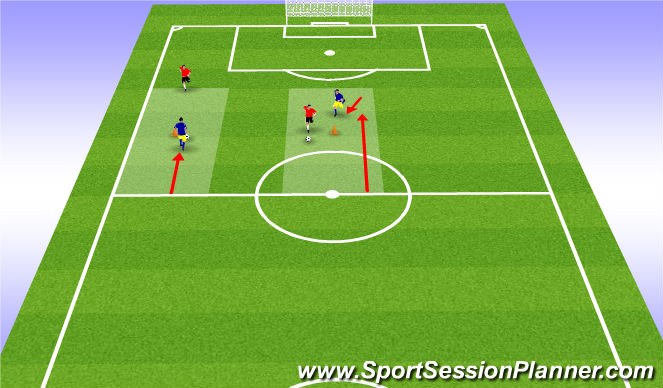 Blue player dribblers the soccer ball to the red player attacking the orenge cone.