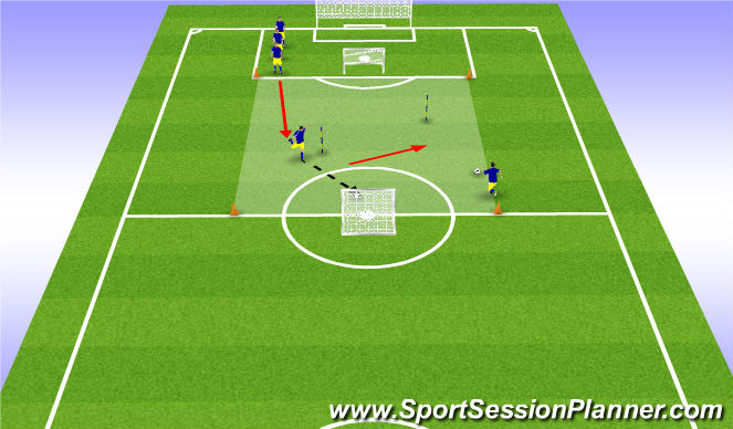 first player dribblers the ball towards the first pole, takes a touch around the pole setting them selfs up to shoot