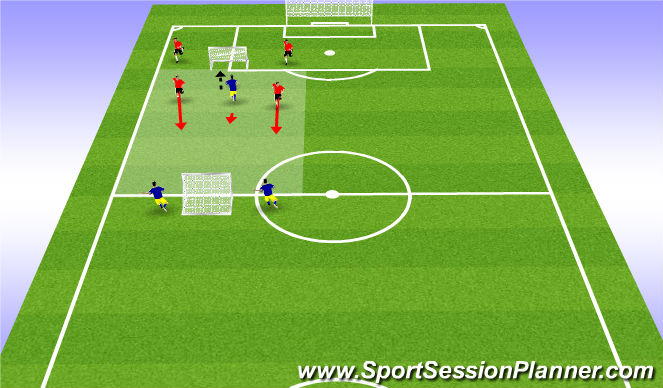 the blue player then lays the ball off to the red players who dribblers at speed to the opposite side.